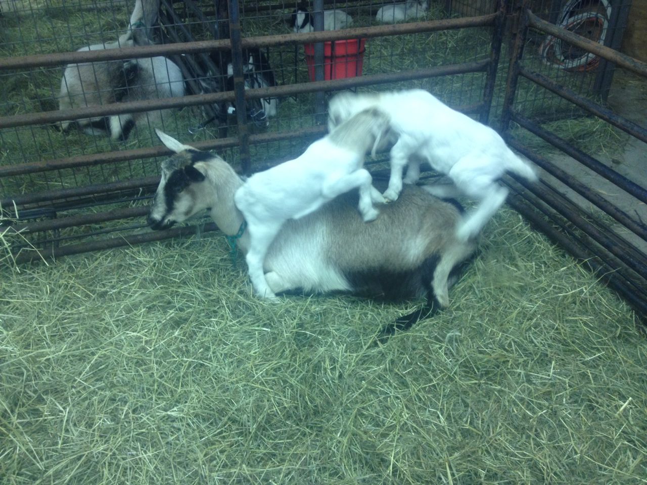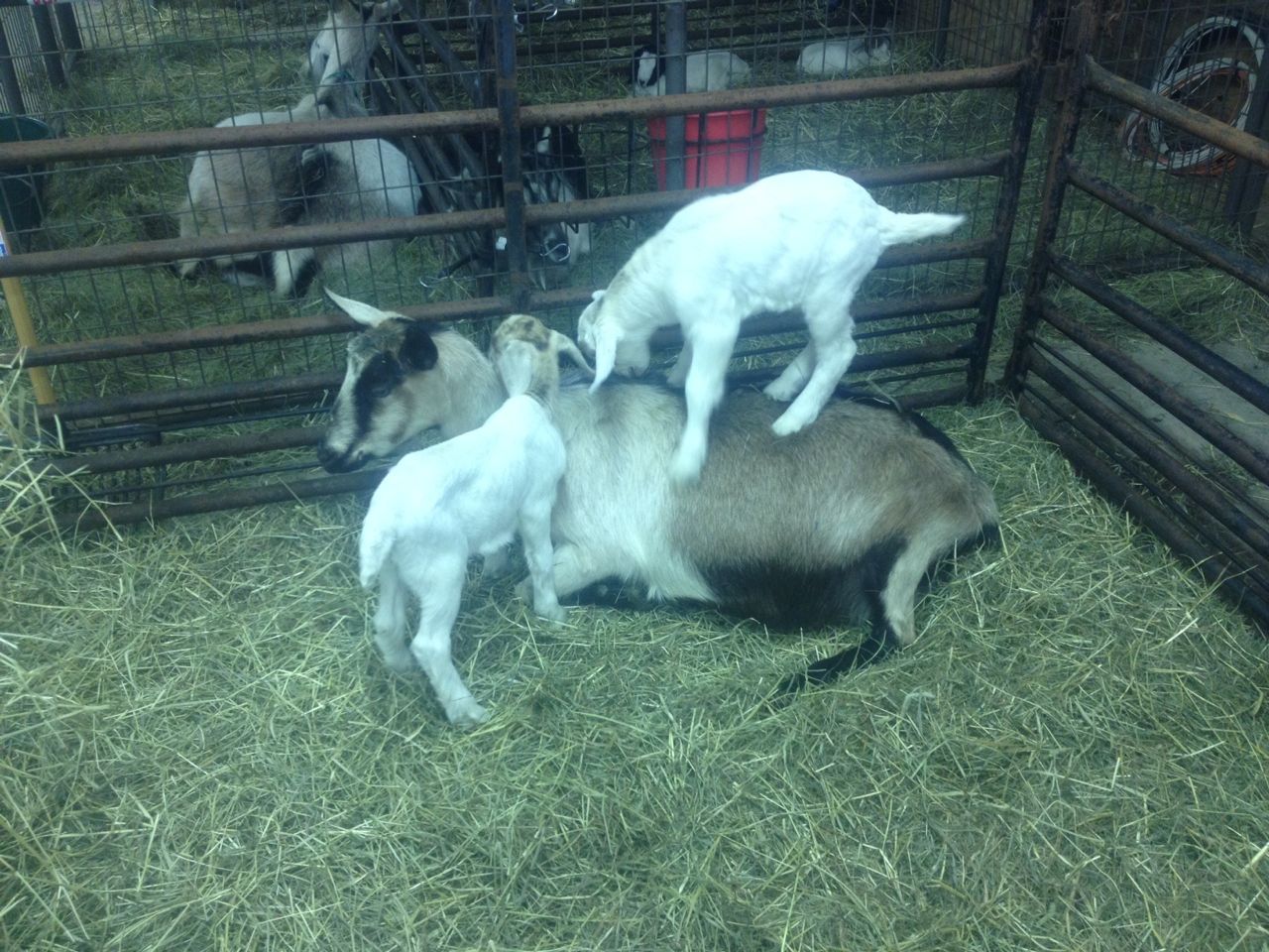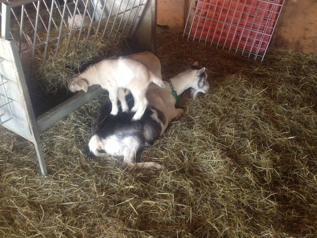 That's our Alpine dairy doe Twink, letting her two kids use her as a step-ladder to get to the hay feeder. The first thing goat kids learn to climb is their moms, who are incredibly tolerant of this. Twink had two boys, or bucklings as they're called at this age, and when they were born on March 26 one weighed 11 lbs and the other 8.5 lbs. (4 kg and 3 kg). They are quite a bit heavier than that now, so that's well over 20 pounds of kids she's got standing on her.