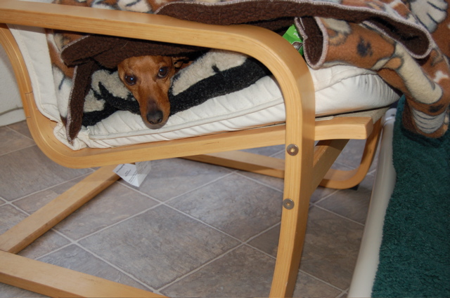 I know this looks like an empty chair.  Sure it does.  There's even a nice fleece blanket you can pull around yourself after you sit down.  Except in this house — as in most homes outfitted with Dachshunds as accessory items — you stand a very good chance of having a very small dog burrowed underneath all that bedding.