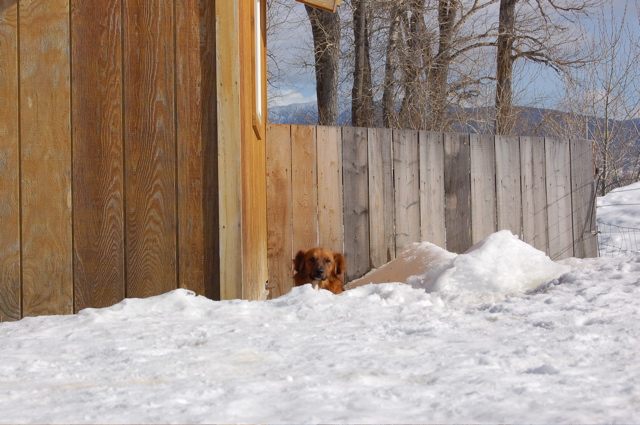 Bare ground is a rare and coveted thing at the ranch in February. You can usually find it only right next to building walls that are facing south (at least until a new snowstorm fills it all in again). I went out just now to put the dogs back up in the cottages for the afternoon and found wobbly Soba had found her patch of bare ground next to Keisha's Cottage. She had been sunning herself there for her mid-day lunch break. Her sister Noodle was not too far away, also enjoying the sun.