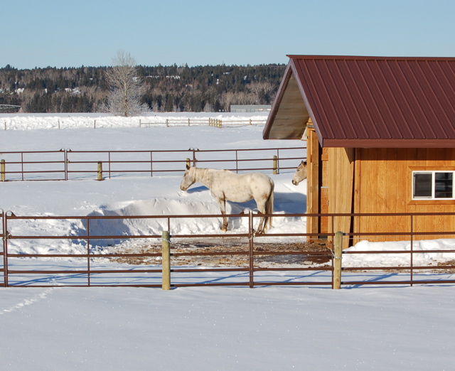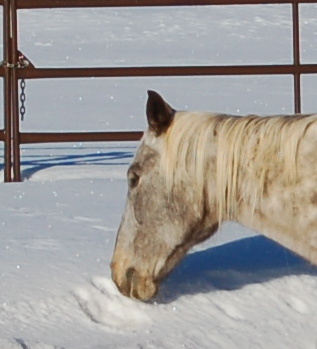 Luna was in the classic equine sleeping-while-standing mode where they're dozing but conscious of their surroundings. Her ears swiveled back in my direction when she heard me approach with the camera. The snowbank was just the perfect height as a prop for her chin. From Beauty's Barn I could see indentations in the snow where the combination of the weight from her head and the warmth from her breathing had left "muzzle prints."