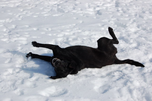 There's just about nothing harder to photograph than a black dog on white snow, but Alayne managed to get these shots of blind Evelyn rolling around in the white stuff. Evelyn loves to roll, whether it's on grass, dirt, mud or … snow. Anything will do just fine, thank you.