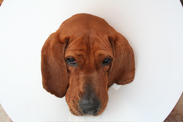 This isn't really a smart thing to do under any circumstance, but for a hound it's particularly stupid because you have these big, pendulous ears flapping around — and they are the first thing to get bitten. Although it's hard to tell from this photo, he's got nice little wounds on both ears, and because he keeps pawing and scratching at them, they weren't able to respond to treatment. Hence the cone.