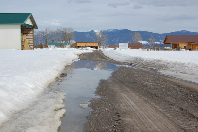 Our snowpack is finally starting to melt — we call this time of year "The Big Melt." I took this photo of our drive on Sunday afternoon, and then we woke up Monday morning to three inches of new snow on the ground and a drive that had disappeared. But the three inches has melted away, the drive is visible again, and that pond is even bigger today.