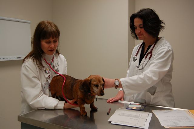 Callie and I left the ranch early this morning and headed to Pullman, Washington, to see specialists at the WSU veterinary teaching hospital for her brain tumor. In the photo above, veterinary oncologist Dr. Janean Fidel is listening to Callie's heart during the initial exam, along with 4th year vet student Jen K. Dr. Fidel later brought in Dr. Annie Chen, a neurologist, for Callie's consultation.