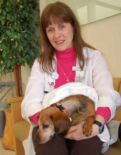 Callie had her MRI this morning at WSU's veterinary teaching hospital, followed by a spinal tap for analysis of her cerebrospinal fluid.  I took this photo of Dr. Fidel, the oncologist, holding Callie after she had recovered from the anesthesia.  You can tell she is still pretty much out of it, bless her little heart.  The back of her neck was shaved for the spinal tap.
