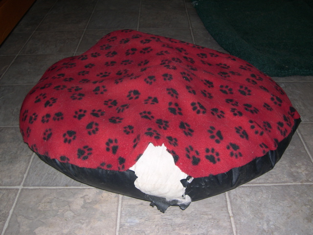 Now, please note that this otherwise fine bed was designed for dogs to sleep on top of it, not inside it. But obviously some small, scurrying creatures with sharp teeth (rats? Dachshunds?) had other ideas on how best to use it.