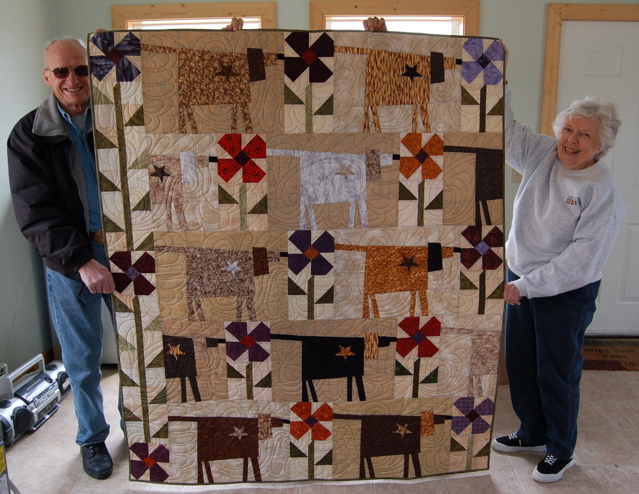 Barbara and her husband Scott came by yesterday afternoon to show us her latest quilt. I took the photo of Barbara and Scott in our welcome center. (Alayne belongs to the mysterious fingers holding up the quilt in the middle.)