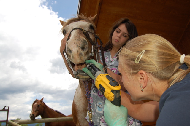 Late last week our equine vet, Dr. Angela Langer, came out to do dental work on our horses. (Angela is a colleague of our primary equine vet, Dr. Erin Taylor, at Blue Mountain Veterinary Hospital in Missoula.) In these photos she is "floating," or filing down, sharp points on the teeth of blind Bo using her DeWalt "PowerFloat" equine dentistry tool. Assisting Angela is Amanda A., a visiting vet tech student from Chicago who is doing an internship at the clinic this summer. Just like people and animals like dogs, horses need regular dental exams and periodic work.