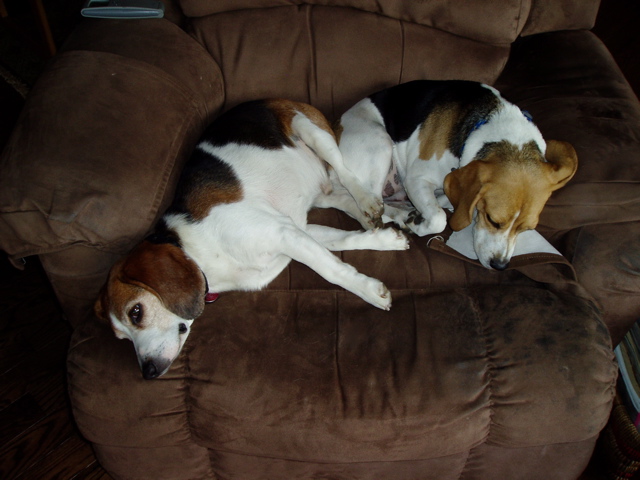 “Been a while since we last wrote and gave an update on Stuart. From the attached photos you can see that he has settled in and gone back to his belly up sleeping pattern! He is an absolutely great companion and continues to thrive alongside Daisy. These two have bonded extremely well. They go for a long walk every evening and have become a hit in the neighborhood. Everyone wants to pet the Beagles and always comments on how they are just perfect together. Stuart usually draws the most attention, to the dismay of Daisy who has a bit of a jealous streak. She retaliates by nibbling at his shoulders once they get home.