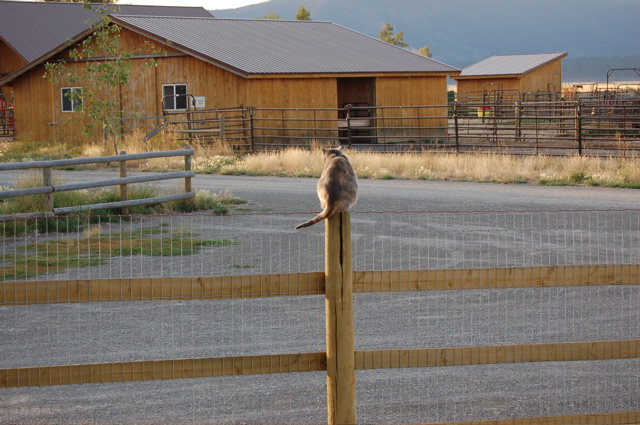 Alayne got this shot over the weekend of Smudge, one of our barn cats, sitting on a fencepost by our backyard. Her view isn't nearly as splendid as the scene another of our barn cats, Spark, enjoyed back in February, but what it lacks in contemplative beauty it makes up for in practicality. In short, Smudge is much more likely to spot a hapless mouse going across the drive or a corral from this vantage point. But if a mouse doesn't happen to wander by, she can still use the fencepost as a launching point to pounce on her brother Smoke or sister Skitter if they make the mistake of walking by the fence underneath her.
