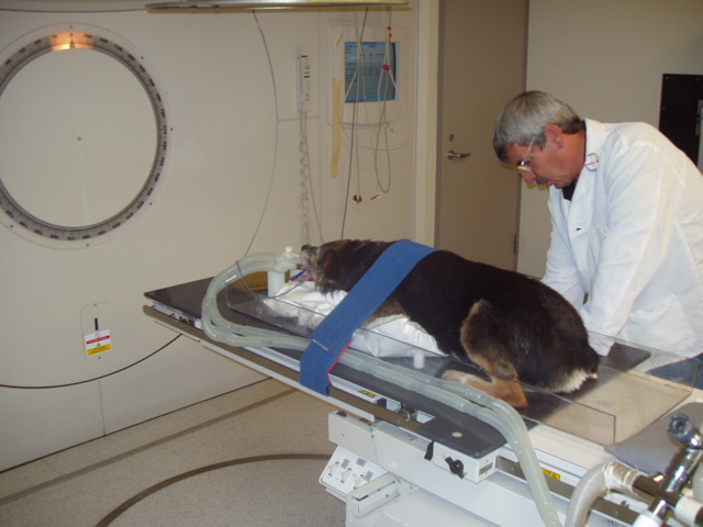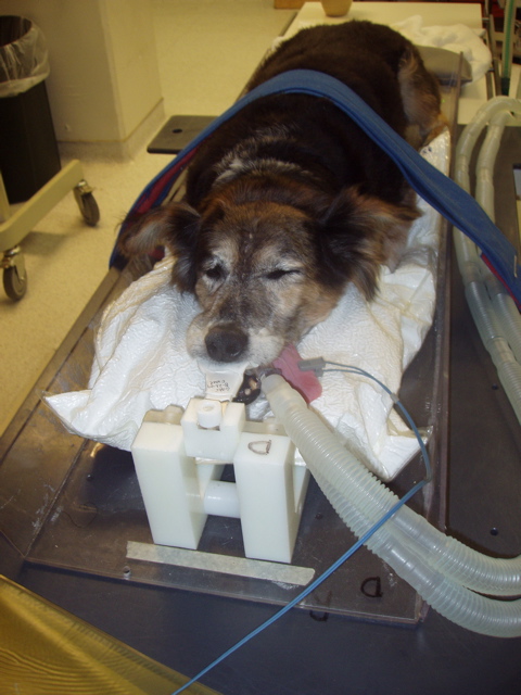 The 4th year vet student at WSU who is Gabe's case manager, Katherine W., kindly emailed me these photos of Gabe going through radiation treatment on Thursday. As it turned out, Katherine was Gabe's case manager earlier when he went through the operation a few weeks ago to remove the nasal tumor; she was on surgery rotation then and is now on oncology rotation, so she's had Gabe both times.