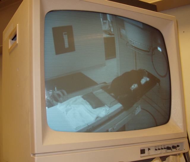 — "The first picture [above] is Gabe being put under anesthesia for the procedure. We administer the anesthetic gas with the mask and then once they are asleep we place the endotracheal tube through which they receive anesthetic gas during the radiation itself." [That's Katherine on the left; I don't have a name for the person on the right.]