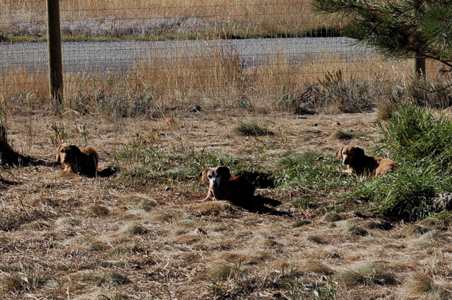 I took Teddy out the front door this morning so he could go pee and looked over to see this sight — three Dachshunds flying low in close formation. Amazingly, they were still like this when I came back out with the camera. That's lead pilot Bailey in the center and his wingmen Oliver on the left and Belvie on the right. All three were enjoying the bright morning sunshine.