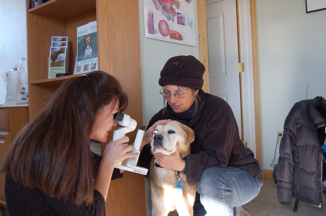 Our vet Dr. Brenda Culver came out today for our annual health exam and vaccination day for the dogs and cats. Brenda hadn't seen blind Madison before, so she did an eye exam as part of Madison's complete physical. The very first thing we noticed gave us that "ohmigosh" feeling — Madison's pupils dilated as soon as the light from Brenda's slit lamp hit them. It's called a pupillary light reflex, or PLR, and means her retinas are detecting the light coming in. And that indicates it's possible she may be able to see behind those cataracts. It would just be amazing if we actually had two blind dogs in one year who could have their vision restored!