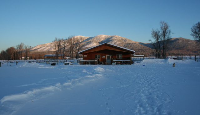 It was 0° (-18° C) this morning when I let the dogs out of Widget's House, and I took this photo shortly thereafter. The sun was finally coming up over the ridge to the east of us and beginning to light up Ovando Mountain behind us. At this point, we're all just waiting for the warmth of the rays to arrive — and when it's this cold, the sun can't get here fast enough. It's been snowing for two days and then it turned into a minor blizzard yesterday afternoon and continued through much of the night. That's why blind Mitch is sitting there off to the right, wondering why I haven't put him in his usual yard yet. Answer: Because the gate to his yard was snowbound and needed to be dug out. Since I was going to be putting them back inside pretty soon, I decided not to bother digging it out.