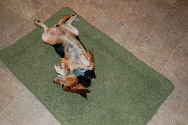 The other evening I heard all this rolling back and forth outside my office door, and turned around at my desk to see blind and wobbly Briggs just having the time of his life. He had woken from a nap and felt so good he just wanted to roll around on his back … and roll he did. This is one of the remarkable things about this boy — despite the double whammy of his wobbliness and his blindness, he is just one of the happiest, most joyful little characters we have.