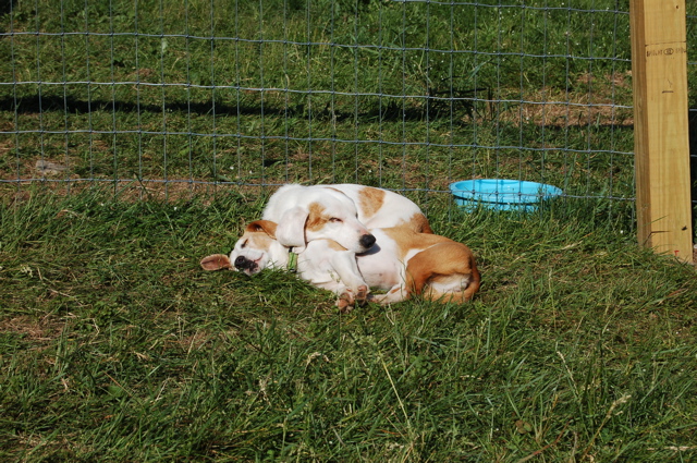A few minutes after I took the photo and went back to scooping, they bounced up and began zooming around the yard. A short while later I was finishing up another yard and looked over to see them back in the same spot, napping once more … but this time with Katie using Spencer as a pillow, in the exact same way he been sleeping on her just a bit earlier. I thought, oh, this is too perfect — but as I headed to the house to get the camera again, they popped up and started cruising the yard once more. Oh, well. You get the idea!