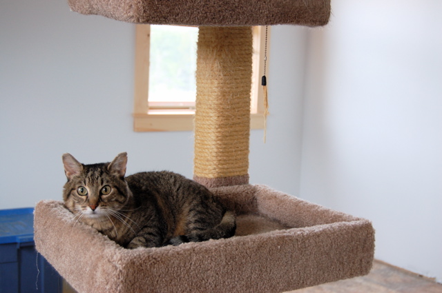 I took the photo of Molly on Thursday in the new cat room on the second floor of the barn. We had just moved them in there the day before, after the flooring was put in. It's not quite finished … you can see we don't have the molding in at the edge of the floor yet, but it will match the pine trim around the windows and should be completed on Monday. Also going in this week will be baseboard heaters.