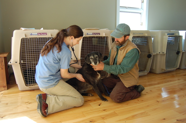 On Tuesday one of our vets from the Whitefield Animal Hospital, Dr. Nancy Lefavour, came out to do the annual exams and vaccinations on all the dogs and cats. In the large animal world, when a vet comes out to your place it's called a "farm call," but everyone seems to use this term whether you've got a ranch or a farm or are doing a bunch of small animals or a herd of horses. Our small animal vet in Montana, Dr. Brenda Culver, made these annual visits as well, and our clinic in Whitefield is carrying on the practice. We were set up in the dog wing for it, and Alayne would bring in each dog while I would hold them for Nancy.