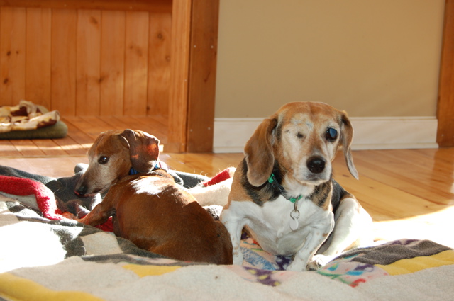 For a while it looked like they were comparing notes on what the doctor said about their respective conditions … "Say, what did the doctor say about you?" As we've reported before, Dexter has a serious case of CSH, a progressive ailment otherwise known as Canine Selective Hearingitis, while Widget has something as rare as Spinner's — BTIDB Syndrome, or Beagle-Trapped-In-Dachshund-Body Syndrome. Sadly, there is no known cure for either problem.