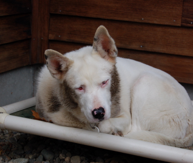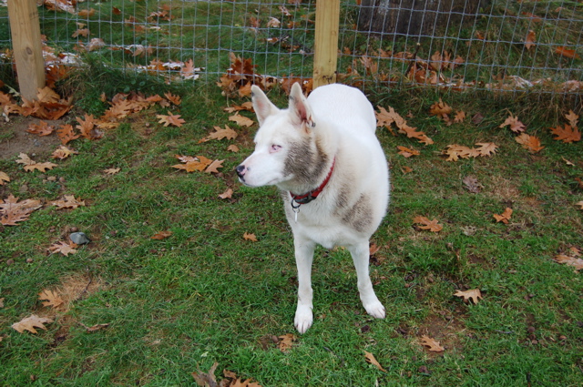 About 30 minutes after we let the dogs out on Saturday morning, I was walking down the hallway between the two wings and looked outside to see Spinner apparently trying on a new costume for Halloween. I guess when you're pure white, the best disguise is to simply smear mud on yourself … but on both sides, perfectly matched:
