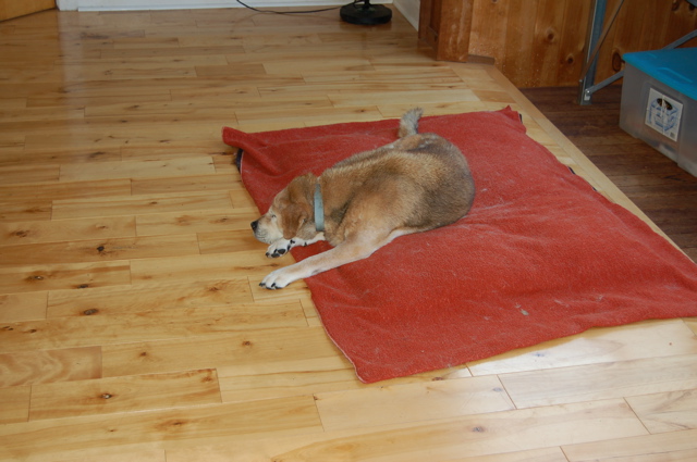 I'd wanted to photograph them together because they are the only two dogs who enjoy "house privileges" in the dog wing, i.e., get to sleep anywhere they want at night and not in crates. We've found over the years that the more dogs left loose in a room unsupervised, the greater the likelihood someone is going to pee overnight. It's like the more dogs there are, the more discipline and self-control break down … I'm not sure why that is, but I suspect the same is true with humans, too. And some dogs just can't or won't hold it overnight. In any case, through a process of elimination (no pun intended! honest!), we ended up with these two older girls with "house privileges" for the dog wing. (Holly and blind Goldie are the only two who get to stay out all night in the people wing.)