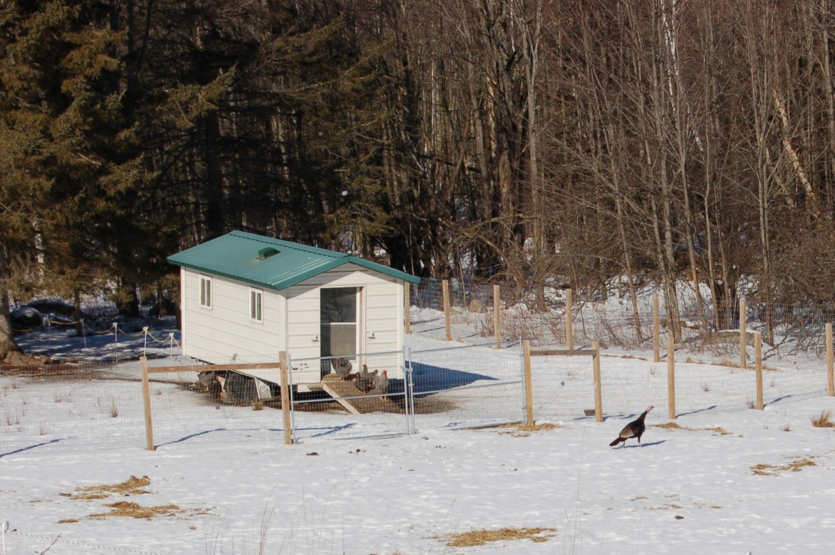 You can see our chickens were out on the ramp of the eggmobile, sunning themselves and watching their larger cousins. If you click on the photo for a bigger image, you should be able to see our rooster, Duke, at the front of the ramp, standing guard. He is foolish enough to try and take on a tom turkey weighing two to three times his size, but the fence protected him from himself. We know he's foolish enough because he will also take a run at us on occasion, which results in a dust-up that he loses every time, much to his diminished pride. Current score is something like Steve/Alayne/Kate 21, Duke 0. We keep a rooster not because you need one to get hens to lay (they'll lay just fine without a rooster), but because we'd like to hatch out our own chicks this spring.
