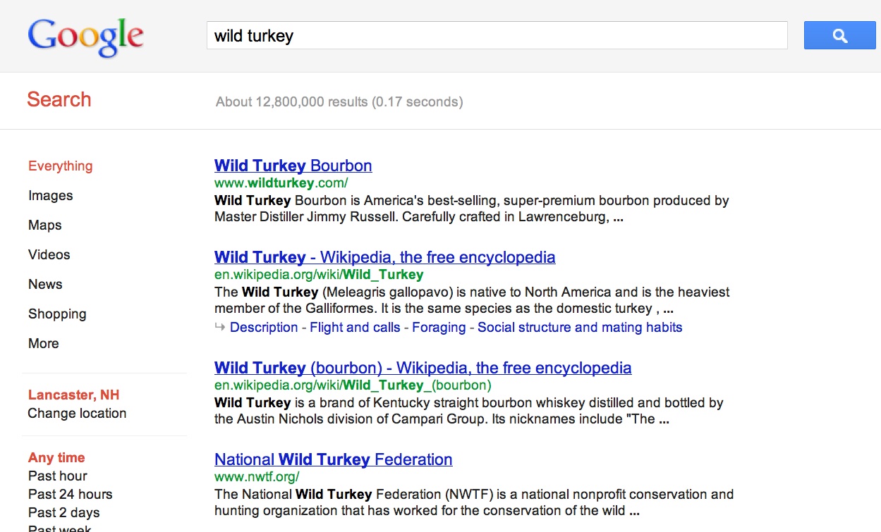 I'm not sure what to make of the fact that if you search for "wild turkey" on Google, the bourbon is the number one search result and counts for two of the top four results: