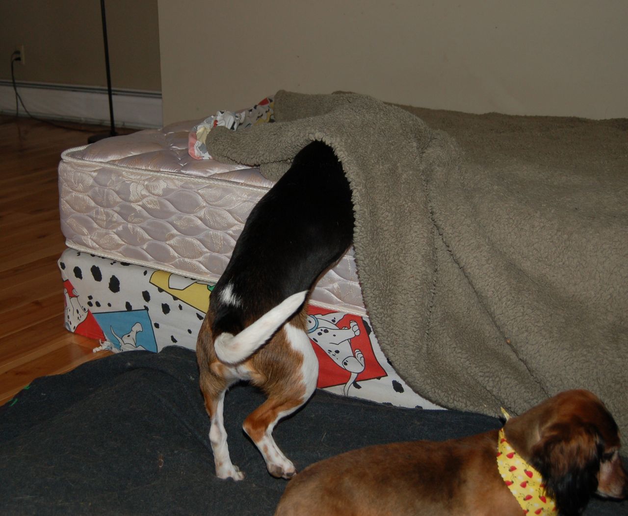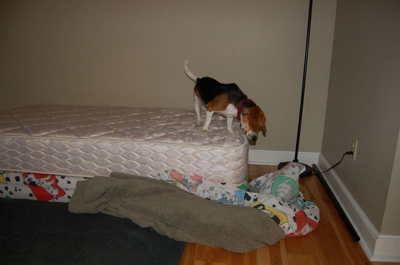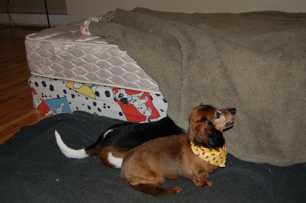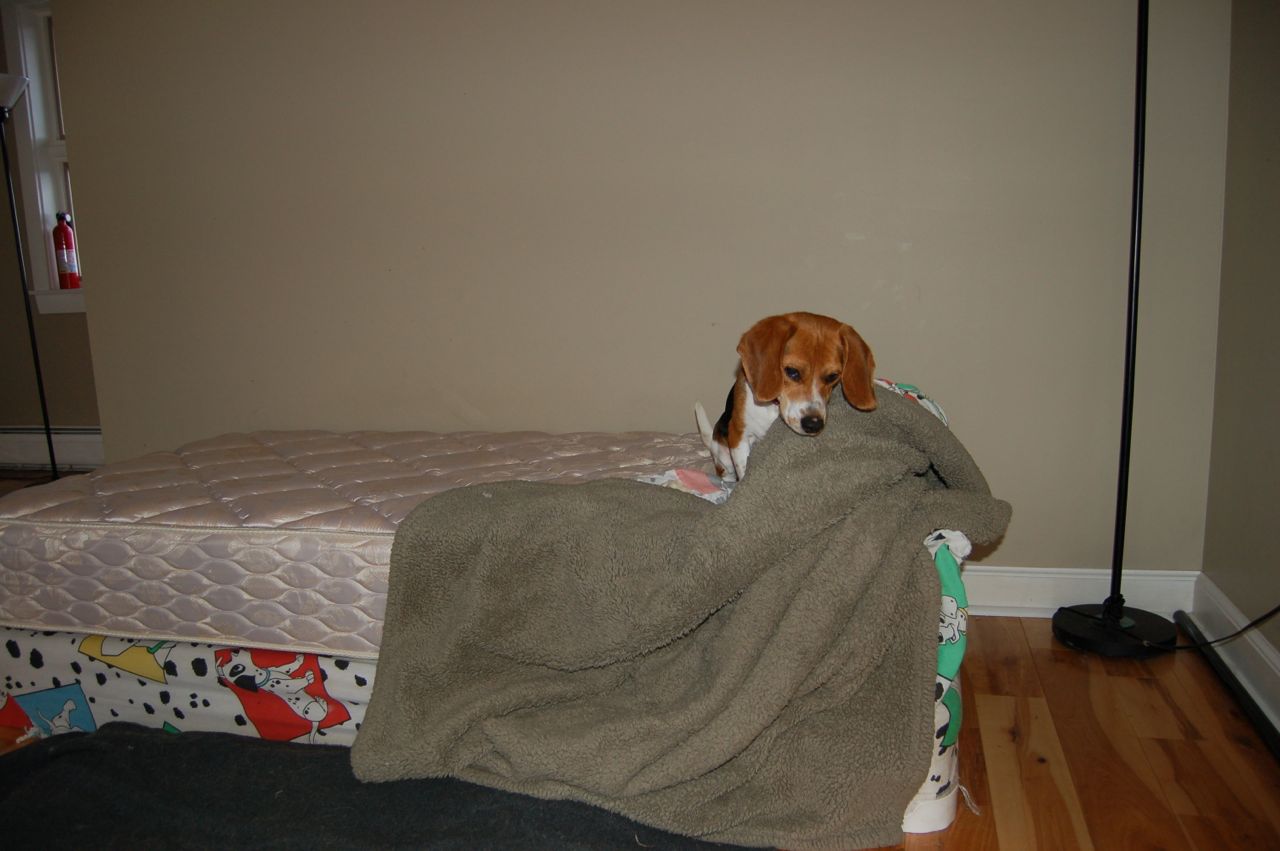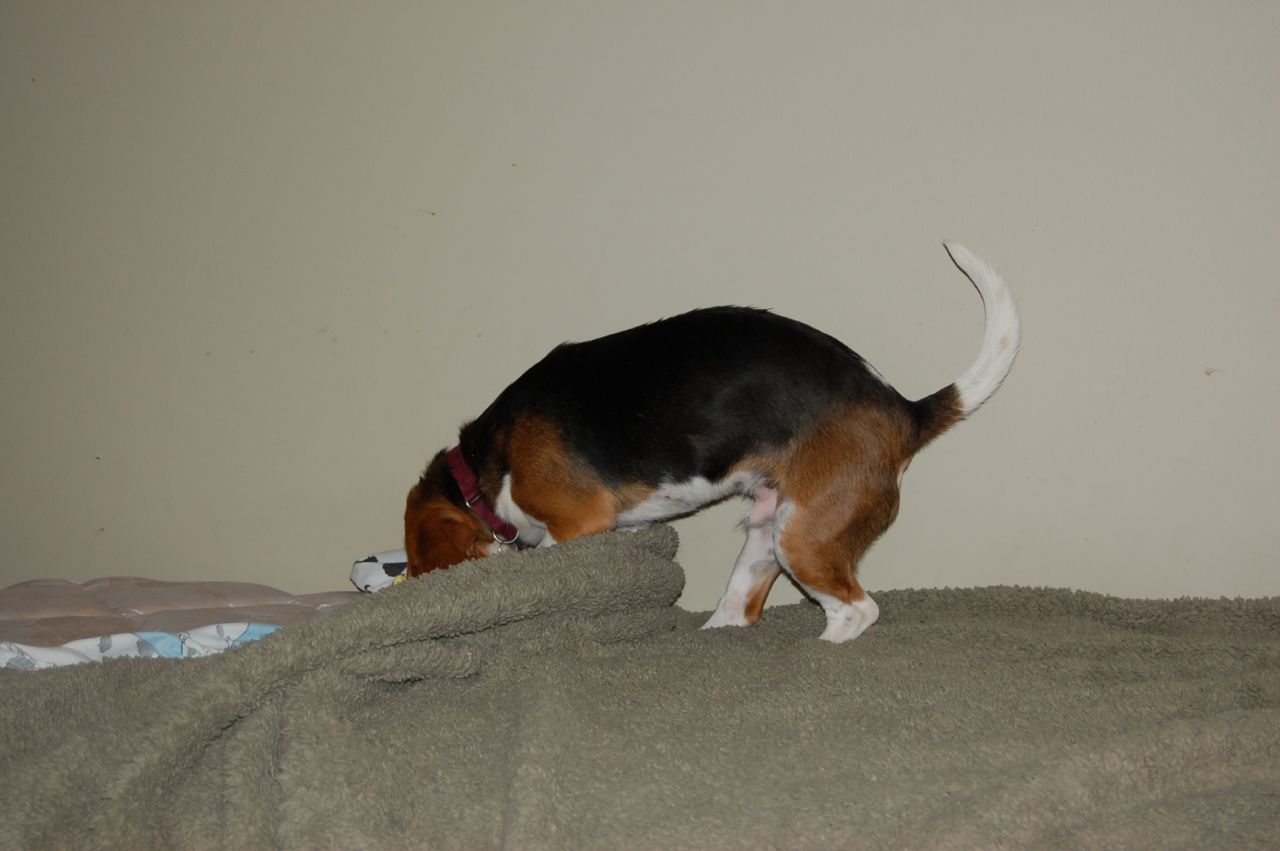 The other day Alayne saw blind Owen starting to crawl underneath the blankets on the bed in the dog room. She picked up the camera to see if she could chronicle what he was going to do next. As it turned out, he decided to unmake the bed — for reasons known only to himself.