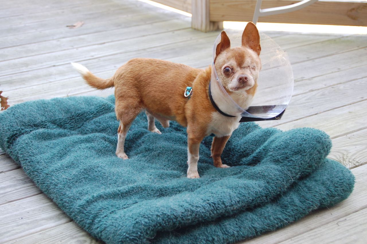 Just a quick update on the little tyke — the photo is from last week, when he was out on the back deck during that warm spell for a change of scenery one day. He is recovering well from his eye surgery, and has quite the daily routine of multiple eye drops from morning to night and a regimen of medications. He continues to be a wonderful patient through all this. I took his eye pressure over the weekend with our Tono-Pen, and it was in the normal range. That's the best indicator that his eye is doing great following the removal of his lens. If the pressure is off, then we've got a problem.