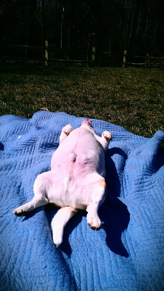 Wendy M., who adopted blind and deaf Baron and blind Stoney from us several years ago, recently sent us this photo of Baron sunbathing. Now that is one relaxed and happy dog. (And no, he's not sunburned, that's the pinkness of his skin accentuated by the filter on the camera lens.) More proof that being blind and deaf sure doesn't take the enjoyment out of a dog's life.