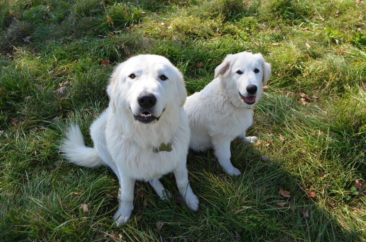 That's our oldest Maremma on the left, Gina, whose job it was to train Aaron when he came as a puppy last year. On the right is Joshua, Maggie's brother. The puppies are about 5 months old now. Gina and Aaron together are training the youngsters this year. Although they are one happy little pack, Joshua likes to hang out with his Aunt Gina, while Maggie has a big crush on her Uncle Aaron: