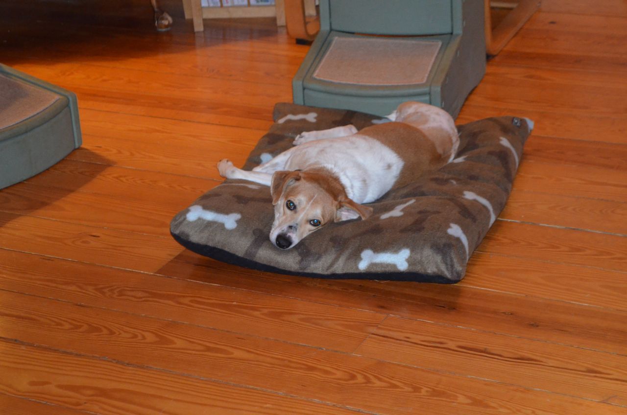 One of the first things we noticed about Tanner when he arrived was how he sloped down in his hindquarters while standing or walking. It looked like that half-leg he was carrying around was literally weighing him down. If you go back and look at the various photos in his arrival blog post, you'll see what I mean. Here's one of those shots: