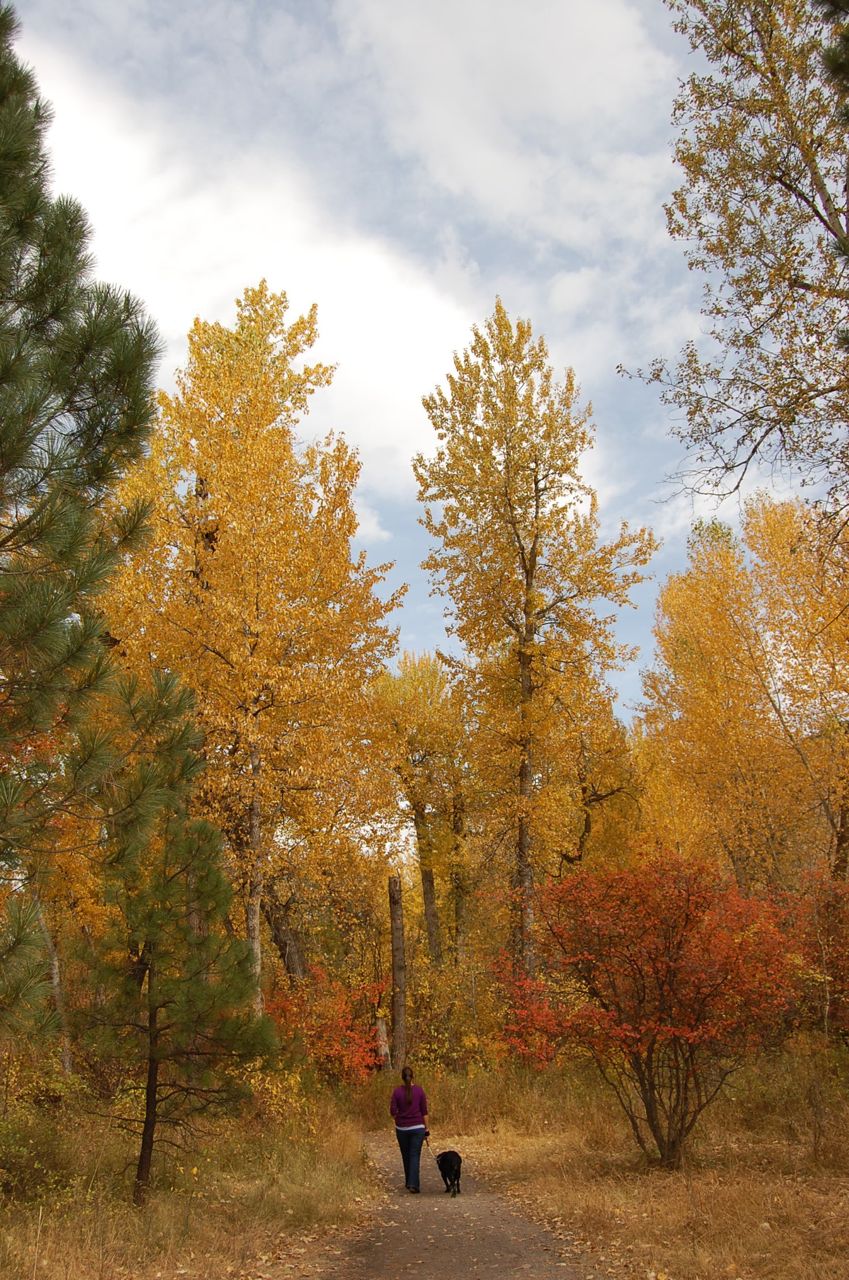 Here's an update on another of our adoptees — blind Luke, who came to us in 2006 from a Montana shelter and who was adopted in 2007 by Kate W., one of our fabulous long-time volunteers. Kate's mom Laura, who also had volunteered at the ranch in Ovando for years — what a great team! — took these photos of Kate and a now gray-muzzled Luke a couple of months ago in Missoula's Greenough Park. The park is where Kate took Luke for their first walk together, and it's been their favorite place for walking ever since.