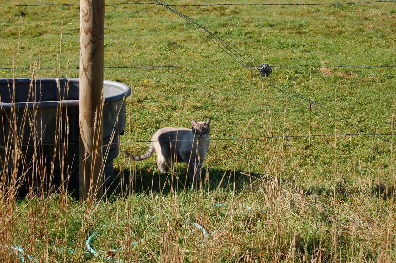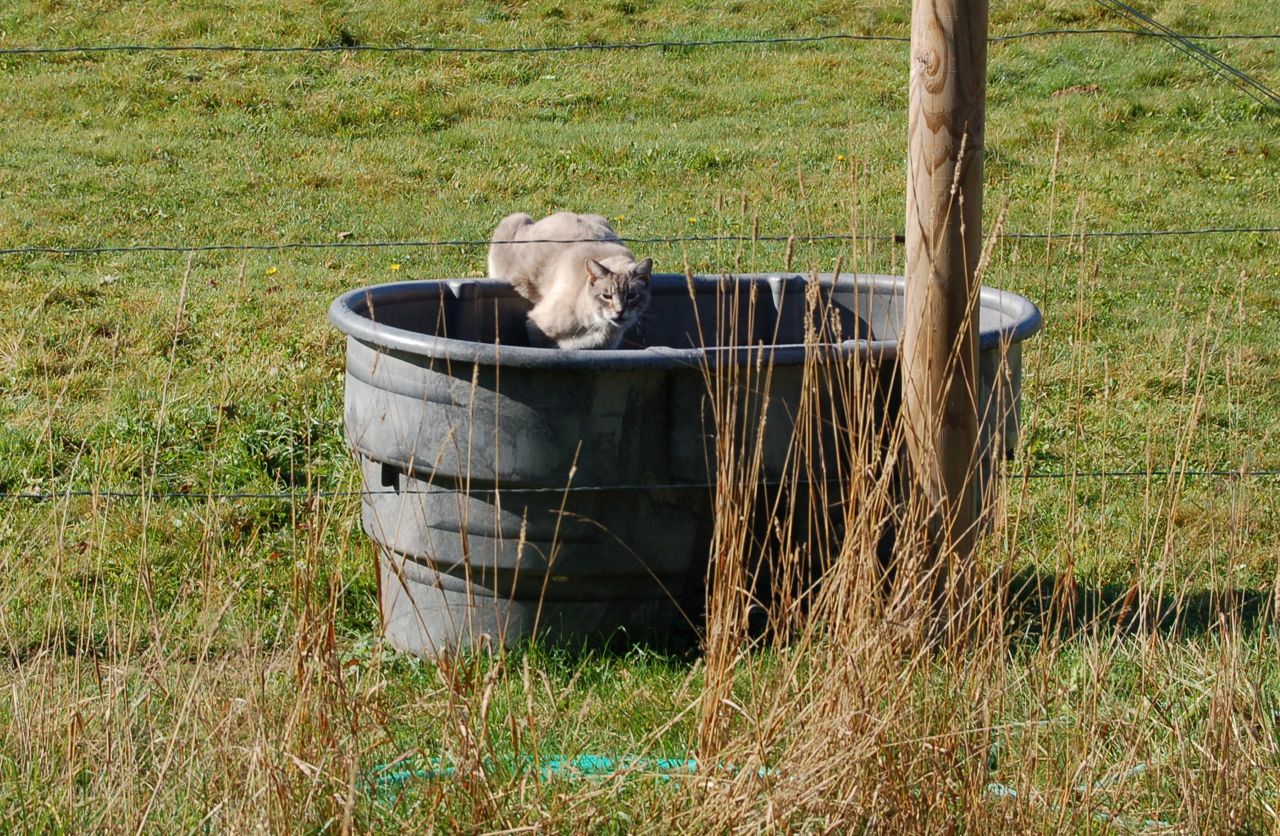I looked out of the house the other day and saw our barn cat Smoke perched on the side of a stock tank, lapping at the water. Now, this is the kind of thing barn cats do that can give you a heart attack, because your immediate thought is, oh my, what if he falls in? Smoke is definitely what I would call a "professional" at the barn cat business, having been with us for almost twelve years now and having flourished at both the Montana ranch and here at the New Hampshire farm. He's a smart boy, has never been hurt, and generally always has his wits about him.