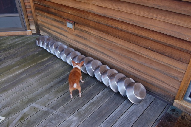 I took the photo a few days ago, after the dog dish had collected the previous night's rainfall — two inches. We feed blind Jake his dinner outside in his yard because he often needs to, um, "use the facilities" right after eating. After bringing him in for the night, I forgot to pick up his dish until the following morning. I was no longer surprised to see how much rain we got all at once — these heavy downpours seem to be more and more common. You can see in the photo that the raindrops hit the ground so hard they splattered dirt off the ground and into the dish.