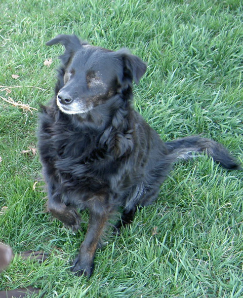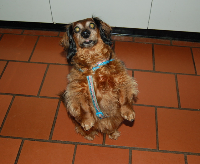 This is our new arrival, blind Sophie, who has this adorable way of sitting up on her hindquarters to beg for food from the table. Given her plump, oblong shape, this is not an easy thing to do. Gravity is not her friend, so she often wobbles around on her rear legs before coming back down to earth. Nevertheless, she loves doing this, and truth be told, it is hard to resist. She is also relentless — one morsel from the table convinces her that this is a surefire way to get more treats, and she'll keep hopping up and begging as long as we're at the table. She kind of reminds me of prairie dogs popping up out of their holes, although the prairie dogs are, I admit, more elegant in their movements than Miss Sophie. She often looks like she's going to tumble over at any moment.