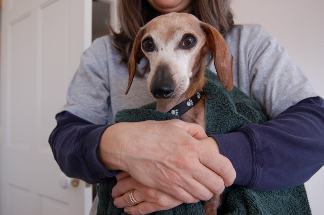 Our internal medicine specialist, Dr. Bryan Harnett, was waiting on Widget's other lab test results to come in before deciding on what to do for heart medications. During his echocardiogram of Widget's heart on Monday, he noticed enough changes in the valves that he thought it was probably time to start her on some meds. Dr. Harnett wasn't alarmed by what he saw, because the changes were the type you might expect in an older dog, but he thought it was time to put Widget on medication to help her overall heart function. We think she's about 10 or 11 years old.