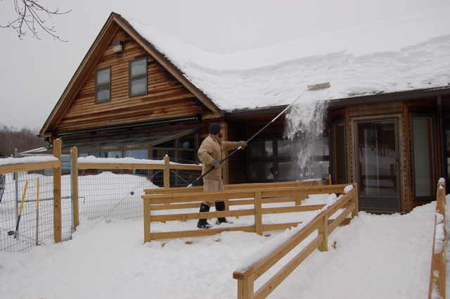 Kate was driving the truck with hay down to the corrals to start feeding when she looked over to the pasture and saw blind Lena lying on her side in deep snow, tangled up in the fence, with a brace post laying across her. Lena had somehow gone right through the fence and was lying on the outside, pinned up against two fenceposts, one at either end of her body. Kate called me — I had just returned inside and was in my office — and Alayne and I grabbed our coats and boots and went rushing out.