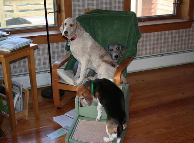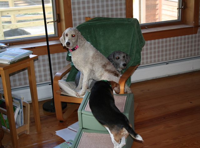 I took this shot on Friday night as we were starting to put the dogs up. That's Daisy on the left and Bailey on the right in their "boats," as we call them. These upside-down open crates are perfect for the incontinent twins. It makes cleaning up after them in the morning a lot easier, and they like having that "convertible" feeling with the open top. We elevate the boats to make it easier to pick them up and carry them outside, rather then having to bend down to the floor to get them. (No, they are not going to jump or climb out and hurt themselves; we've had the boats on the floor for a long time first, and they've never been able to get out by themselves. Because of their neurological problems, neither Daisy nor Bailey has the leg strength or agility to climb over the side of their boats.)
