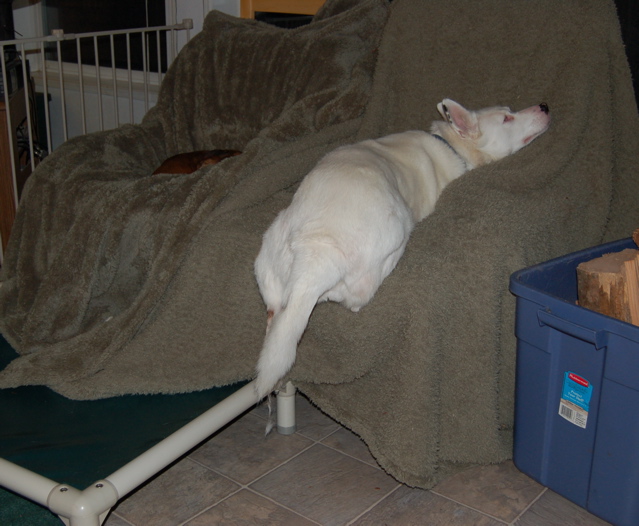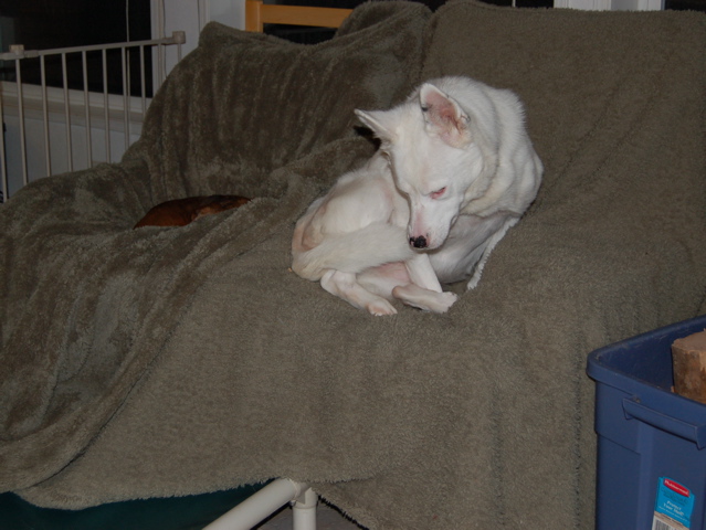 Once I got him cleaned up, I realized what had happened. He had started chewing on his foot, a case of self-mutilation. This development meant only one thing: That leg was now starting to bother him. Whether he has odd tingling from nerve sensations (our vets were pretty sure he has radial nerve damage), or it was turning painful, we don't know, but clearly — and quite suddenly — it got his attention, and not in a good way.