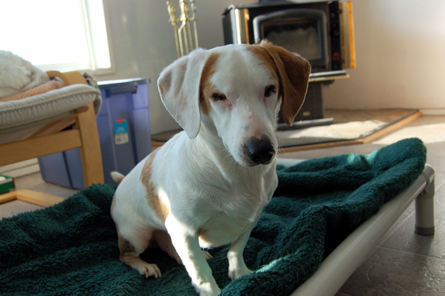 Here's one of the two little tykes who arrived on Friday evening from New Orleans … blind-and-deaf Stevie. He and his sister Helen came from to us from Phyllis F., who runs a small, private rescue group that saved them from euthanasia in a local shelter about a year ago. Since then, Phyllis has tried to find someone to adopt them, but despite posting on PetFinder and elsewhere, she had no luck placing them. So she finally contacted us, hoping we could provide a home for them at the ranch.