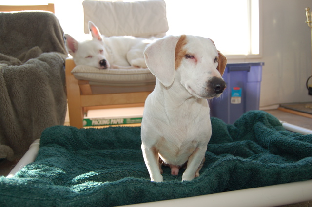 Here's Stevie with blind-and-deaf Spinner on the chair behind him (why the green throw is off that chair is a subject for another post this week):