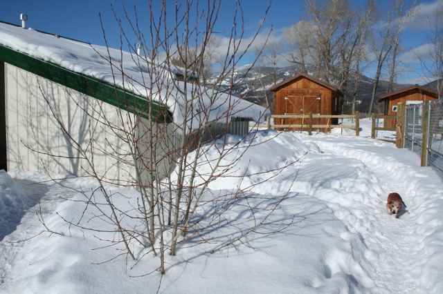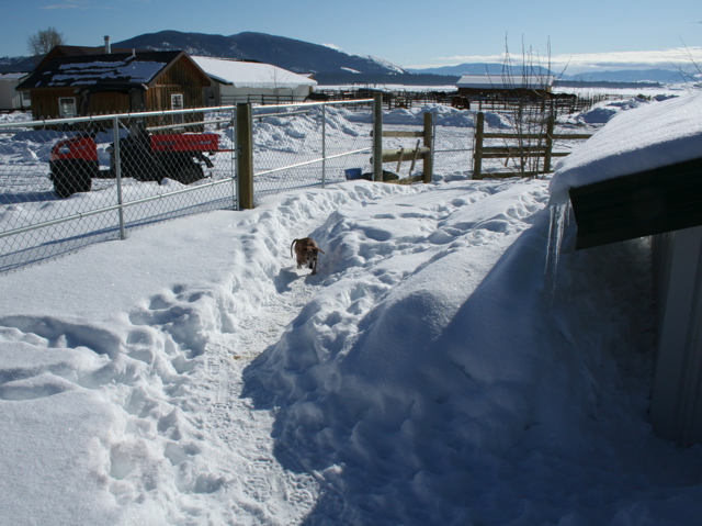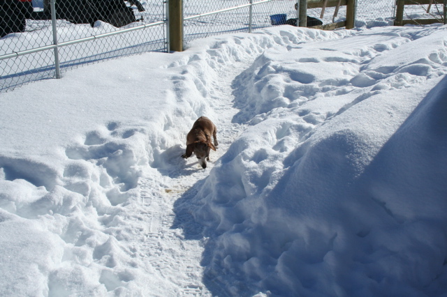 At a certain point in the winter, when the snow gets deep enough, the dogs typically don't go wandering off any longer (with a few exceptions, like blind Helen and Widget!) but end up sticking to the multiple narrow paths they create around the buildings. This makes it easier for their humans, too — not only for walking, but for poop scooping, too, since they tend to do their business in the paths. (Be careful where you walk!)