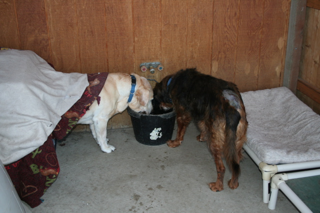 I got this photo this morning of blind Moose and blind Penny drinking from the water bucket on the Widget's House porch. I had let the dogs out just a few moments before. (On Penny, you can see the shaved area where the growth was removed. She's doing fine.)