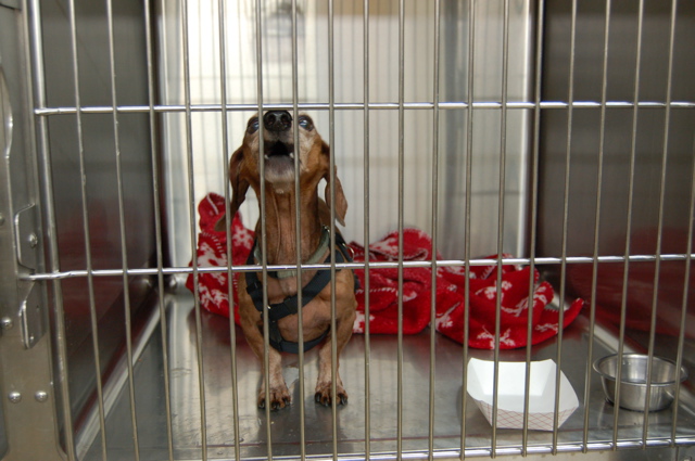 So when I went back to the clinic this afternoon to pick up Penny and Dexter, the wee-one was very vocal about being locked up for no reason at all. And since I didn't move fast enough to get him out, he threw his head back to let rip: