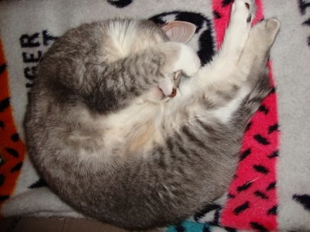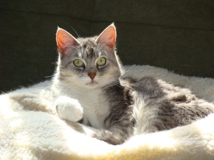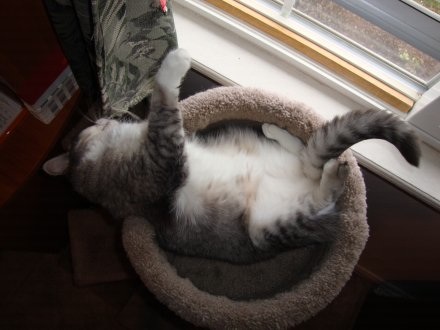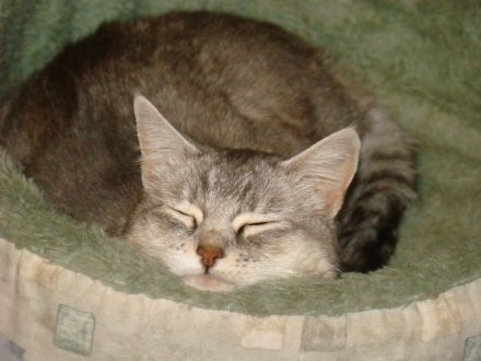 Tia and Karl M. in Washington state, who adopted beautiful little Bunny from us in 2008, sent us these new photos of the cat they now also call Bun Bun. Tia wrote, "I've said this before, she has to be one of the most photogenic animals I have ever had, and again, this cat knows how to relax!"