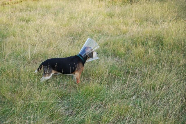 His biggest problem this evening is just that dang cone on his head. That's the part he can't figure out. He keeps catching the bottom of it on the ground and then thinks someone hit the brakes on him, so he stops. I lift up his cone and off he goes again. I took these outside shots after we got back to the hotel and I let him off leash in the big yard at the back of the building. He'd see something happening off in the parking area and stand there looking at it: