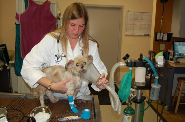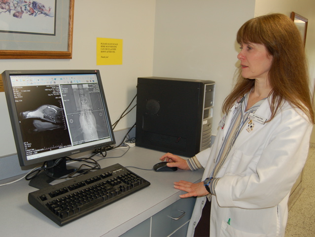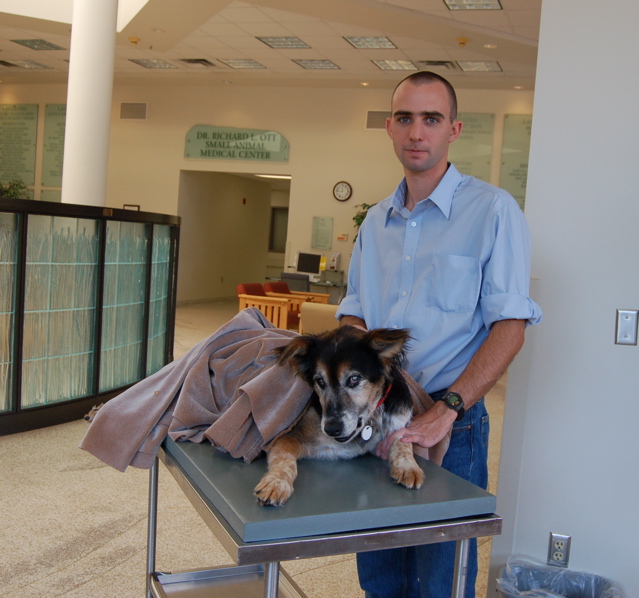 Today was "run around town" day in Missoula — among other stops, a press check on the fall newsletter at the printer, taking Molly and Priscilla to the groomers, and the thing that's been weighing on us … having blind Goldie checked for a new set of skin growths. Goldie has already had a couple of surgeries to remove cancerous growths in recent years, which is why we were alarmed to see three new lumps develop. So I took her to see our internal medicine specialist in Missoula, Dr. Dave Bostwick, this morning for a medical exam. That's vet tech Alex holding Goldie while Dave looks at two growths on her left front leg; a third growth was on her back at the base of her tail.