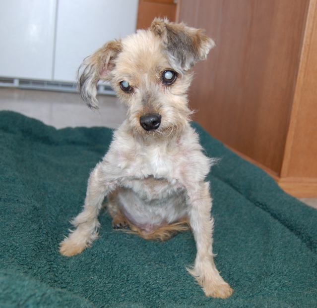 Little blind Teddy went into surgery this afternoon and came through the operation just fine. I took this photo at the clinic a couple of hours afterwards. I had posted earlier this week that our vets at Montana Veterinary Specialists in Helena had seen bladder stones and a dark shape — thickened material of some sort — in his gallbladder during his ultrasound.